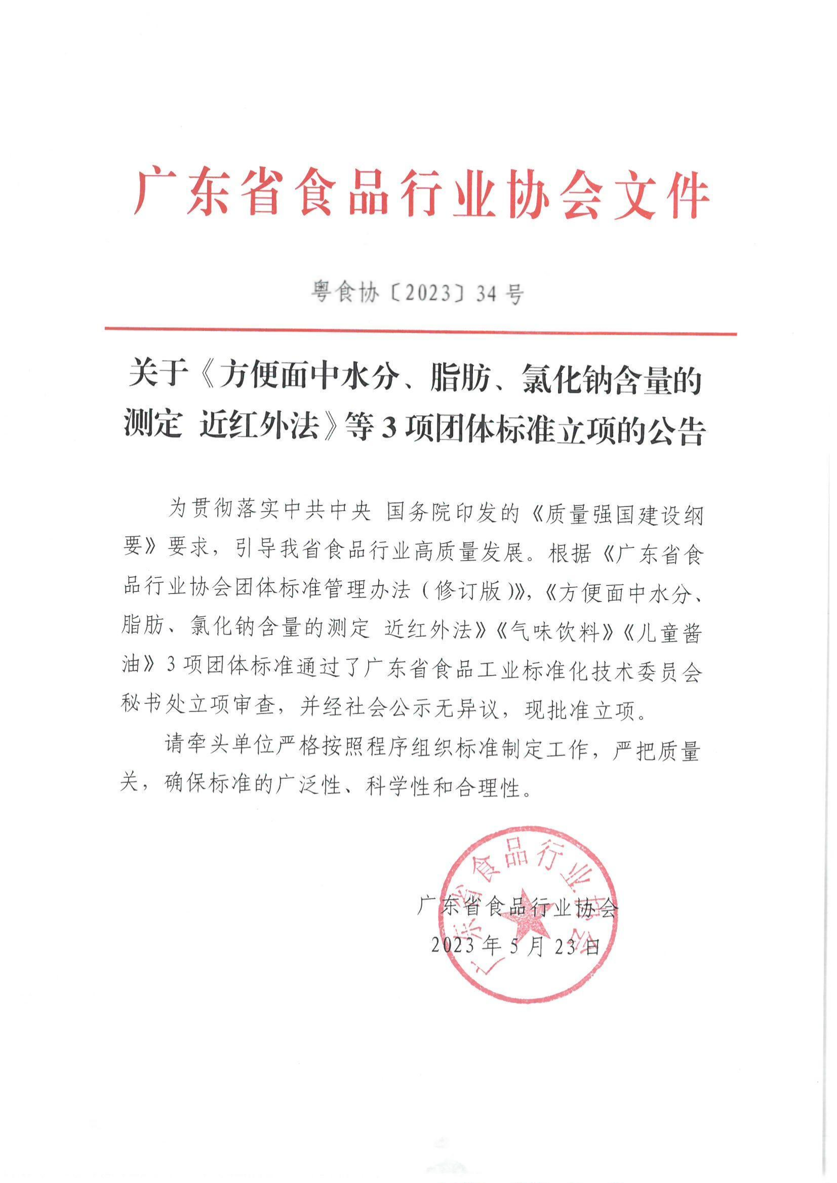 关于《方便面中水分、脂肪、氯化钠含量的测定 近红外法》等3项团体标准立项的公告