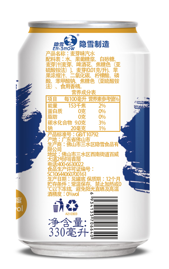 “隐雪麦芽味汽水”以果葡萄糖浆、白砂糖、麦芽汁、麦芽浓缩汁、苹果浓缩汁等为原料,调配成不含酒精但具有明显啤酒风味的汽水。产品主要采用的麦芽汁含有多种营养成份及人体所需的多种氨基酸及微量元素和维生素,不仅具有清凉解渴作用,而且还具有促进消化,调节人体微循环等作用,一年四季皆可饮用。生产时将麦芽汁,白砂糖,果葡糖浆高温灭菌后过滤降温加入食用香精调配好浓缩糖浆,浓缩糖浆稀释碳酸化为成品,液体色泽金黄澄清,不但有麦芽的淡淡香甜,还有一丝苹果香气,味道自然、相互交织。加上细密的气泡,酥酥麻麻又有力量,气感十足,入口瞬间感觉非常清爽,口味清新,回味无穷。产品冰镇后,饮用效果更佳。
