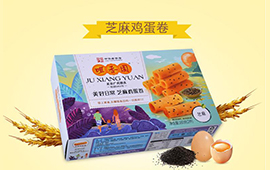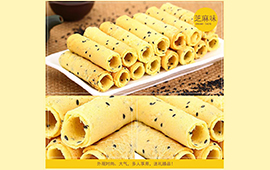 选用优质的小麦粉,白砂糖,鲜鸡蛋,人造奶油、食用猪油,黑芝麻(≥3%),食品添加剂(碳酸氢铵,β-胡萝卜素,特丁基对苯二酚),食品用香精,经过多重工序,煎制而成,呈多层卷筒形态,外形完整,表面光滑均匀,呈金黄色,入口松化,味甜,具有浓郁的芝麻和蛋香味,是广东地区特色传统饼类名小吃。执行国家标准:GB/T 20980 饼干标准。