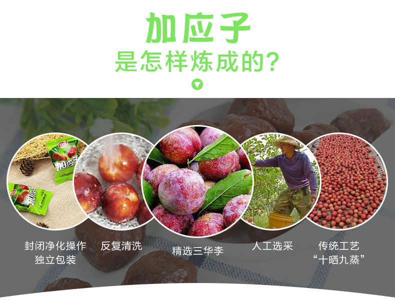 加应子被誉为“中国西梅”,2018年被评为”广东食品行业名牌产品“.选用优质三华李,经过选果分级,清洗,去除苦涩 ,渗糖 ,烘干 ,拌料,阳光房晒制等多道工艺精制而成,果肉饱满厚实,内核小,口感酸甜爽脆开味,老少皆宜。