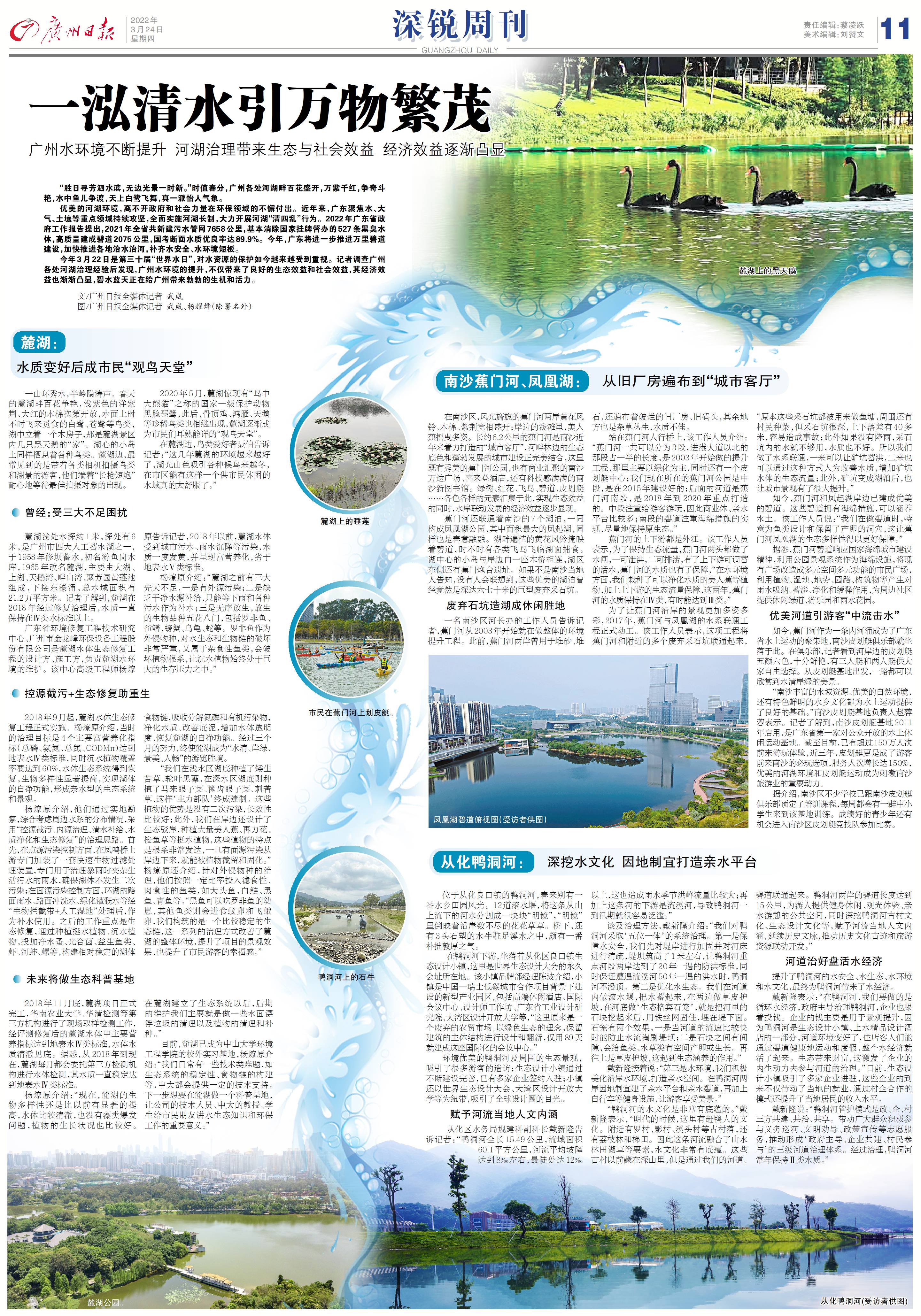 今年3月22日是第三十届“世界水日”,对水资源的保护如今越来越受到重视。记者调查广州各处河湖治理经验后发现,广州水环境的提升,不仅带来了良好的生态效益和社会效益,其经济效益也渐渐凸显,碧水蓝天正在给广州带来勃勃的生机和活力。