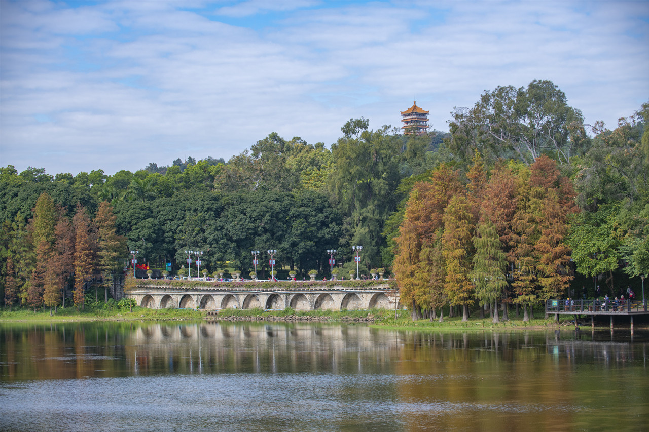 蕉门河还联通着南沙的7个湖泊,一同构成凤凰湖公园,其中面积最大的凤起湖,同样也是春意融融。湖畔遍植的黄花风铃掩映着碧道,时不时有各类飞鸟飞临湖面捕食。湖中心的小岛与岸边由一座木桥相连,湖区东侧还有蕉门炮台遗址。如果不是南沙当地人告知,没有人会联想到,这些优美的湖泊曾经竟然是深达六七十米的巨型废弃采石坑。