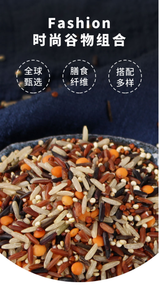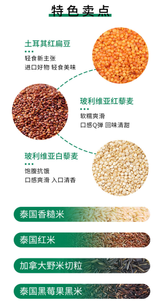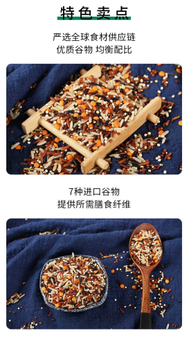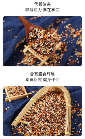 7种进口谷物,营养丰富,品尝美味的时候,能感受到异域风味。每100克产品里面含有5.1克膳食纤维,NRV达20%。膳食纤维有益控制血糖、血脂。此外,产品里面富含矿物质镁,NRV达40%,还含有矿物质钾(NRV 20%)、铁(NRV 14%)。代餐佳选,唤醒活力,素食新宠,健身伴侣。作为膳食宝塔的塔基,五谷杂粮是最好的基础食物,也是最便宜的能量来源。