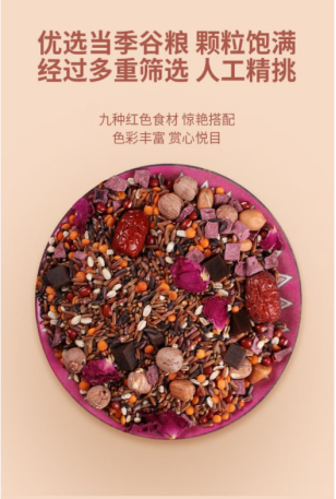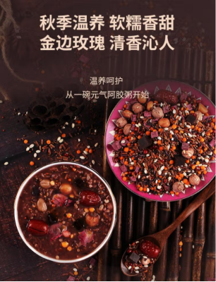 代餐佳选,唤醒活力,素食新宠,健身伴侣。作为膳食宝塔的塔基,五谷杂粮是最好的基础食物,也是最便宜的能量来源。搭配阿胶、玫瑰等滋补食材,均衡膳食,营养丰富,色彩惊艳,赏心悦目,秋季温养,清香沁人。