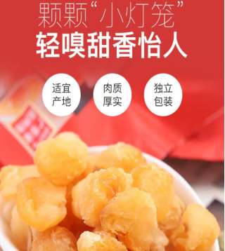 甄选储良桂圆品种,产自广东省高州市,自然环境优良,特有的赤红土壤,保水保肥能力强,非常适合储良桂圆的生长,产地阳光充足,热量丰富,有利于桂圆养分的积累和口感的沉淀。采用蒸汽风干工艺,低温风干,100%无添加,成型完整,全程锁鲜,保留原汁原味。果肉圆、肉质厚,色泽金黄至褐黄,香甜爽口,脆润适度,无渣味长。可当零食,亦可煲汤、泡茶、作糕点馅料食用。