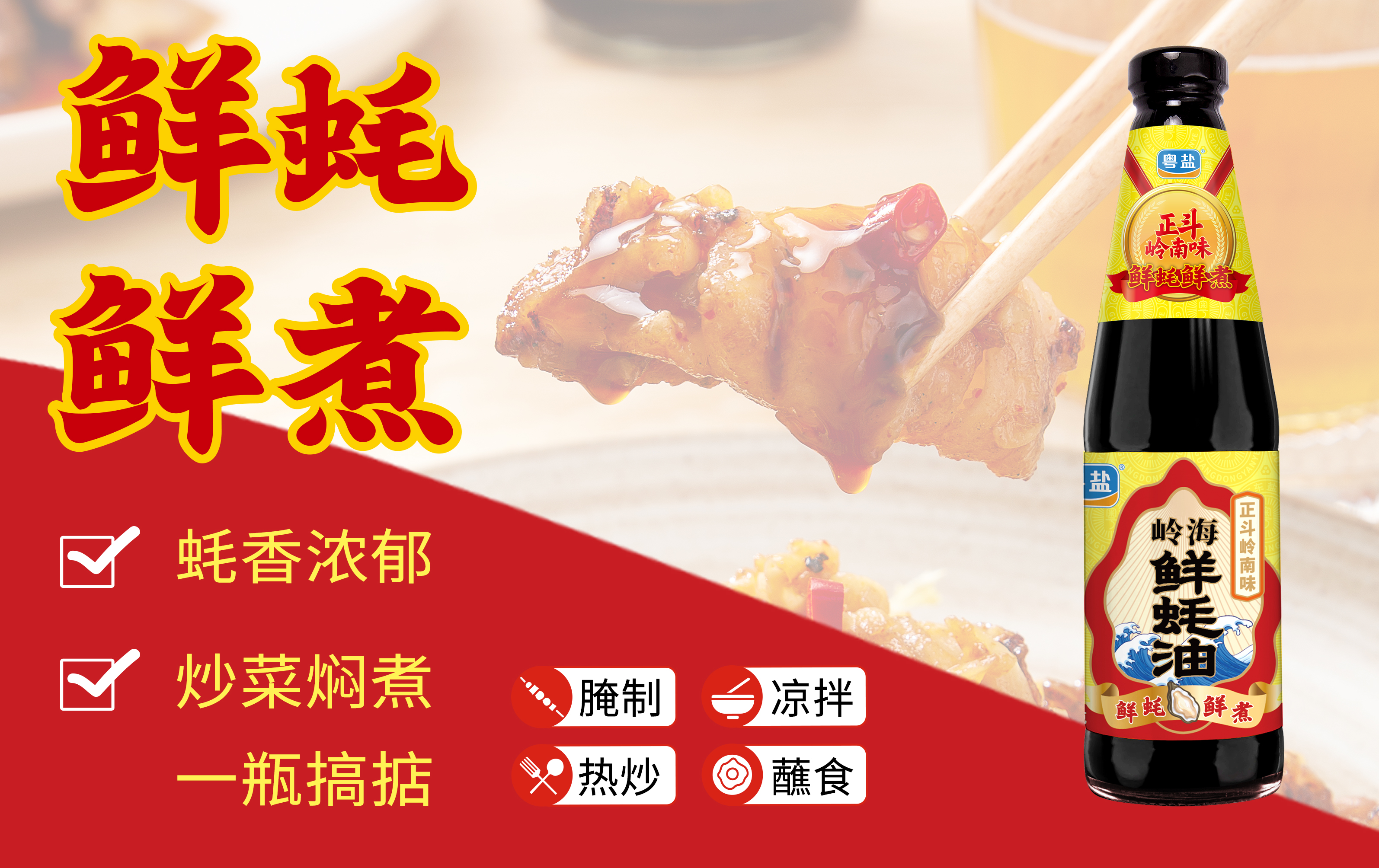 鲜蚝鲜煮:真实添加生蚝汁,蚝鲜味浓。自有优质蚝场:好的生蚝炼优质好蚝汁。蚝汁源自国家地理标志产品阳西程村蚝,优质水源天然养殖,生蚝体大,味道鲜甜,色泽光洁。炒菜焖煮,一瓶搞掂,炒菜加一点,鲜香味浓。